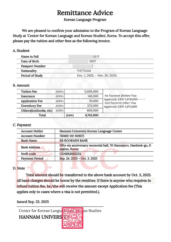 Invoice du học Hàn Quốc của Đại học Hannam